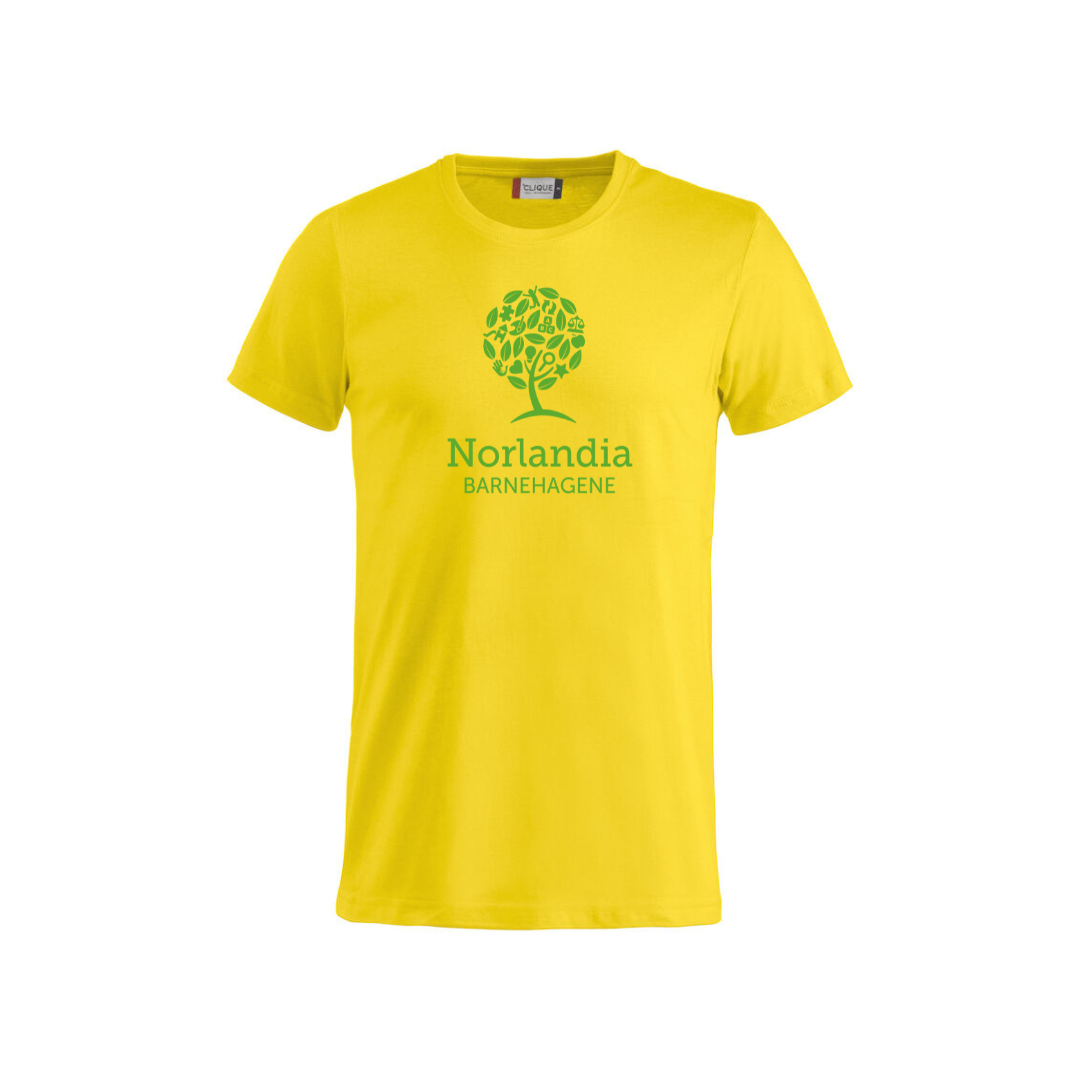 Basic t-shirt i en smalere passform, bånd i nakke, elastan i halsribb og forsterkede sømmer på skuldre. Rundstrikket unisex modell og sidesømmer på damemodell.