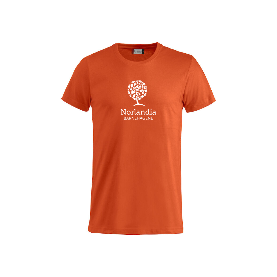 Basic t-shirt i en smalere passform, bånd i nakke, elastan i halsribb og forsterkede sømmer på skuldre. Rundstrikket unisex modell og sidesømmer på damemodell.