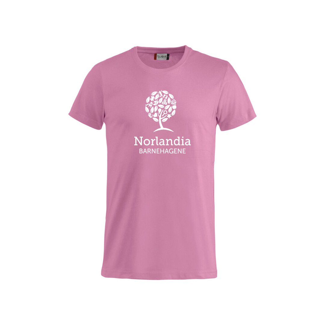Basic t-shirt i en smalere passform, bånd i nakke, elastan i halsribb og forsterkede sømmer på skuldre. Rundstrikket unisex modell og sidesømmer på damemodell.