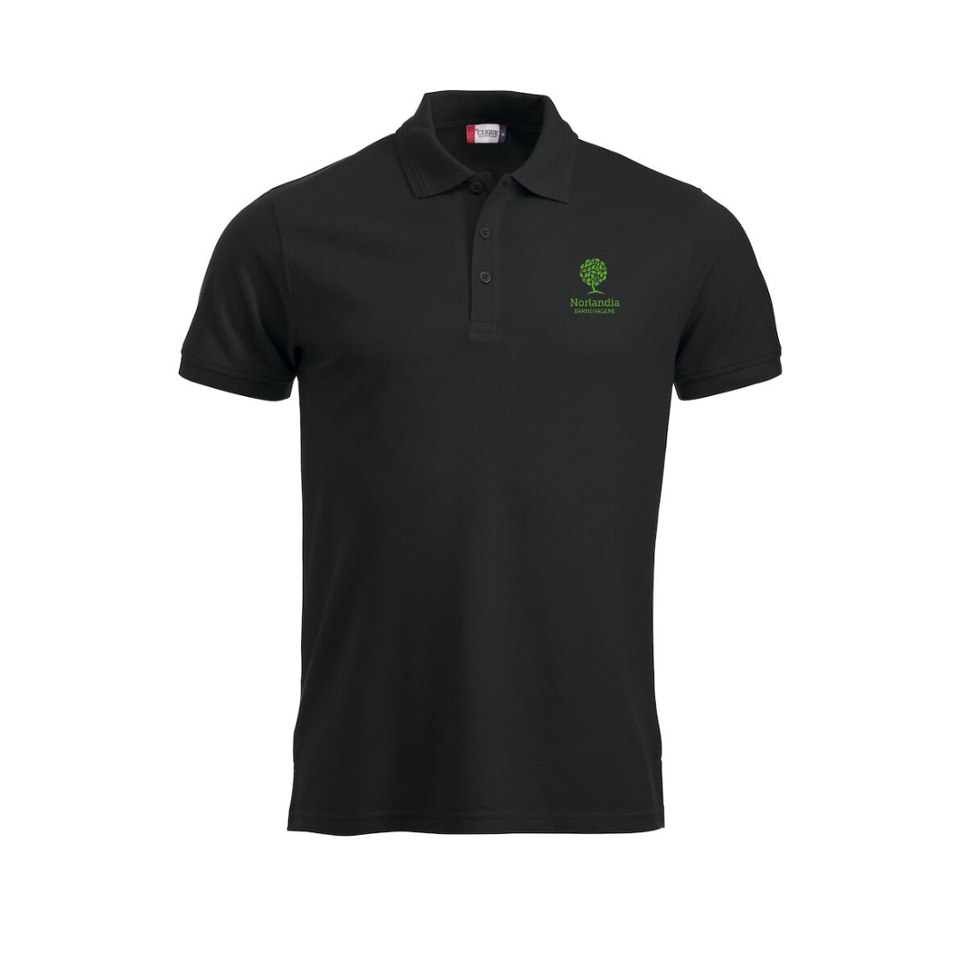 Pique med to jaquardstriper på kragen. Knappestolpe med tre knapper som går ton-i-ton og splitt i sidene.