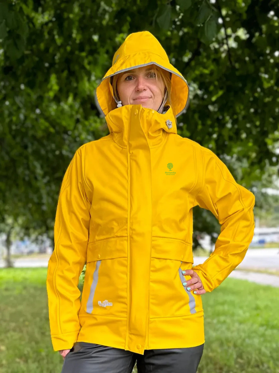 Robust regnjakke i PU til dame er en slitesterk jakke for øs pøs regnværsdager. Den er laget i vanntett PU-materiale og har dobbeltsveisede sømmer.